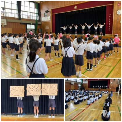 今日の朝は児童集会の日。1年生から6年生で構成される縦割り班で並び、集会委員会の進行でゲームをしました。縦割り班で並んだのは、今年度初めてです。今日のゲームは「ジャンケン大会」。集会委員会の児童が出すグー、チョキ、パーのカードと子どもたちが対戦し、大いに盛り上がりました。