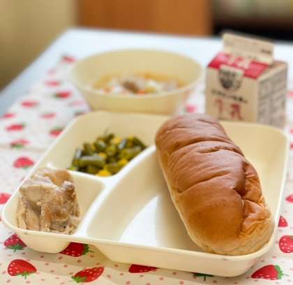 今日の献立は、黒糖パン、牛乳、鶏肉のガーリック焼き、スープ、さんどまめとコーンのサラダです。