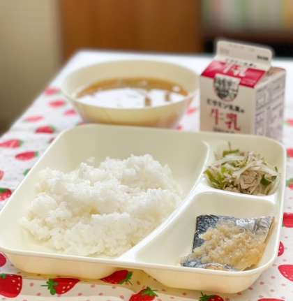 今日の給食は、ごはん、さごしのおろしじょうゆかけ、みそ汁、野菜いため、牛乳です。
