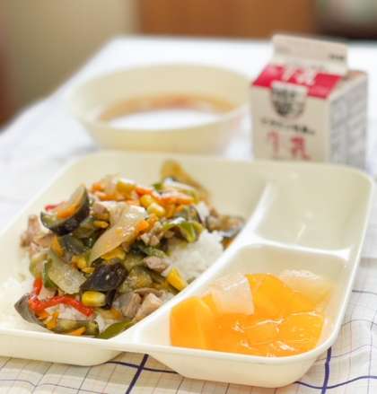 夏野菜飯、パワースープ、トロピカルゼリー、牛乳です。
