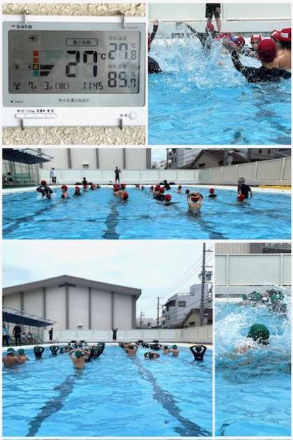 今日の水温は28度。蒸し暑くなりましたが、暑さ指数計も体育の活動ができる範囲の暑さを示していました。