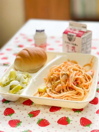 チキントマトスパゲッティは、子どもたちに人気のメニューです。摂取カロリーを抑えるため、今日も小さなコッペパンが1つついてきます。