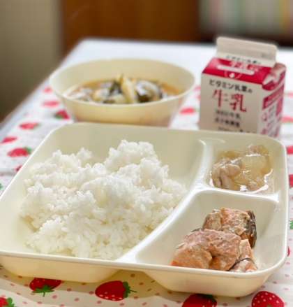 7/10の献立は、ごはん、牛乳、さけのしょうゆ風味焼き、みそ汁、とうがんの煮ものです。