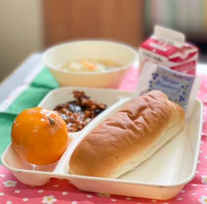 今日の献立は、コッペパン、牛乳、かぼちゃのミートグラタン、鶏肉と野菜のスープ、みかん(冷凍)、ブルーベリージャムです。