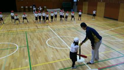 バットを初めて持つ児童やベースを初めて目にする児童も多く、果たして試合はできるのか?とどきどきしました。わかりやすくゲームの進め方を説明していただき、一人一回ずつバッターとなりました。空振りしても何回でもやり直しができます。ボールを打ったら一塁へ一生懸命に走りました。