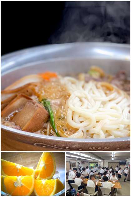 夕食の時間になりました。今日の晩ご飯は、ごはん、すき焼き、オレンジです。