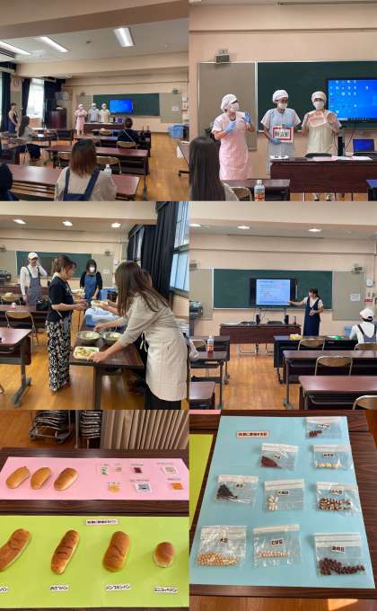 試食会では、給食調理員から挨拶やアレルギーなどについてのお話、栄養教諭の先生からは栄養のことやパンの種類についてお話をいただきました。