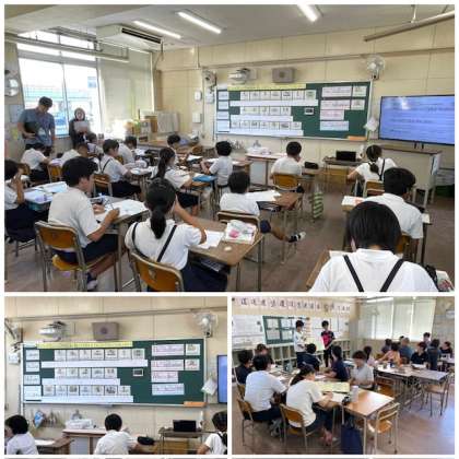 九条南小学校では、英語の授業力向上のために、年間を通して授業実践に取り組んでいます。今日は5年2組で英語の研究授業を行いました。大阪市総合教育センターより指導主事先生とスクールアドバイザーの先生にご指導に来ていただき、充実した授業研究ができました。