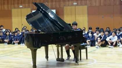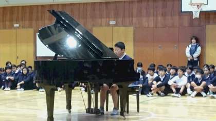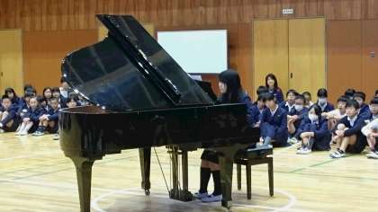今朝の児童集会で、全校児童の前でピアノの演奏をしました。