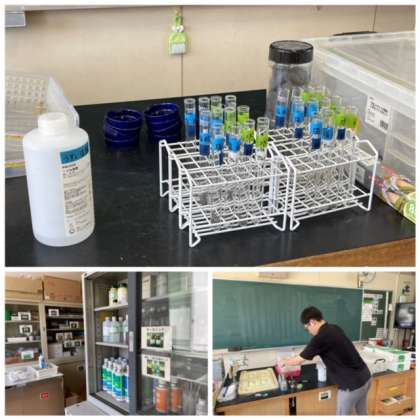 いろいろな教科の中で、理科は特に授業の準備や備品の管理が難しい教科です。本校には理科補助員が配置されており、理科の授業の準備や備品の管理業務にあたっています。試薬を実験で使う濃さに希釈したり、各グループごとに実験に必要なセットをトレーにまとめたり、授業を進めるうえで欠かせない縁の下の力持ちです。