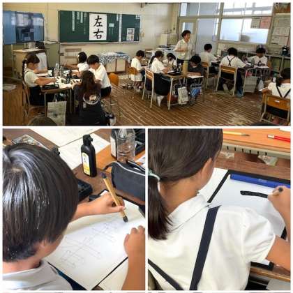 書道の学習では、子どもたちが気をつけるポイントを意識しながら書くことが大切です。左右という字は、左と右と字形は似ていても筆順もバランスも全く異なります。はらいや横線の長さを意識しながら、子どもたちは集中して取り組んでいました。