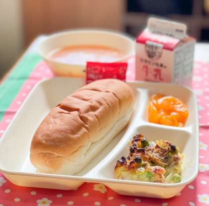 今日の献立は、カレーマカロニグラタン、トマトスープ、みかん(缶)、コッペパン、牛乳、いちごジャムです。