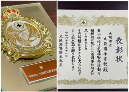 本校の交通安全についての取組が認められ、大阪府警本部長と大阪府交通安全協会より表彰状と立派な盾を頂きました。関係の皆様、ありがとうございます。