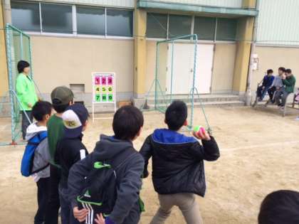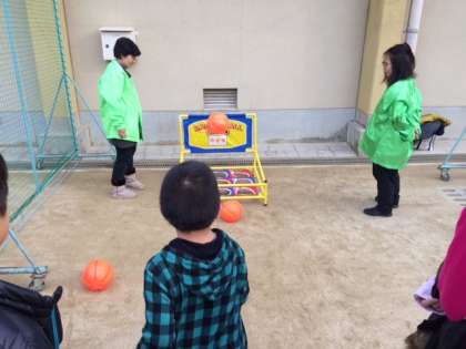 子どもたちは、ビンゴになるように、下投げ・上投げ・横投げ、いろいろな投げ方で挑戦していました。
