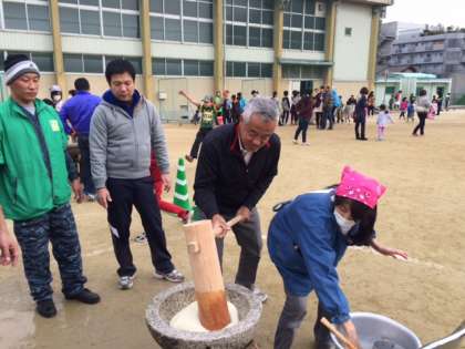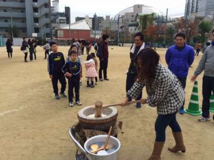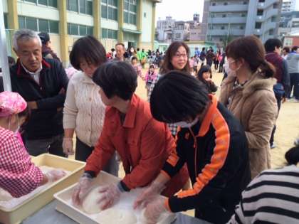 先生方が交代でお餅をつき、綺麗な丸い形に形成するところまで頑張って、九条南小学校の「正月飾りのお鏡餅」をつくりました。