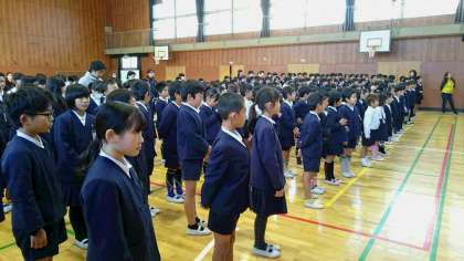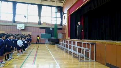 全校朝会 校長講話「あいさつは周りの人を幸せにする」