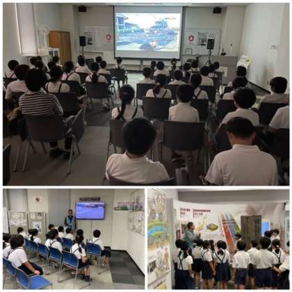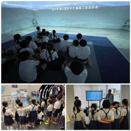 津波と高潮について、映像資料や展示物を見ながら学習しています。ダイナキューブという180度の映像コーナーで津波災害を体感することができますが、子どもたちは津波の脅威を実感したようです。当施設では、津波や高潮の脅威を知るとともに、災害からどのように身を守るか、平常時にどのような備えをしておくかについても学習することができるようになっています。