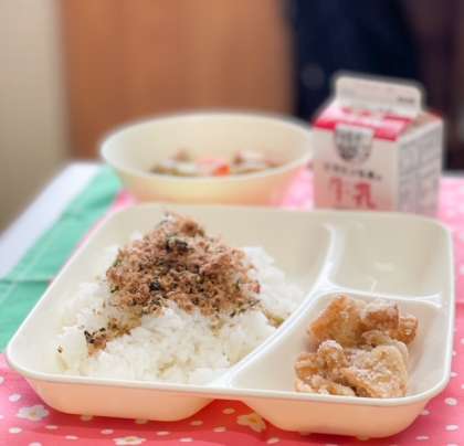 今日の献立は、ごはん、おかかなっ葉、鶏肉のたつたあげ、あつあげと野菜の煮もの、牛乳です。