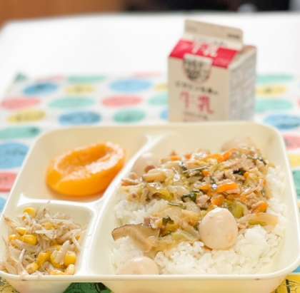 中華丼は、豚肉、うずらたまご、白菜、タマネギ、たけのこ、にんじん、ニラ、しょうが、しいたけと具沢山で、野菜もたっぷりと摂取できます。さらにもやしとコーンまで使われていますが、材料代が高騰する中、給食はコストの制限を工夫で乗り越え、なるべく子どもたちに野菜を提供できるようにがんばってくれています。