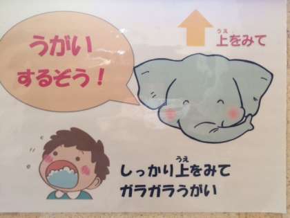 「ぞうさんがいる!」と喜んで上を見ながらうがいをしてくれています。