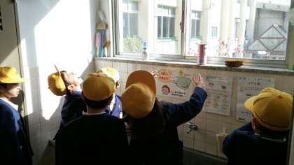 かぜ予防の基本、手洗い・うがいにすすんで取り組めるよう掲示物を貼りました。しっかり上をみて、<ガラガラうがい>ができるように・・・