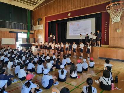 先日全児童に行った、好きな本アンケートの結果発表や図書委員会のお仕事の紹介、来週から始まる読書週間についての話を伝えていました。