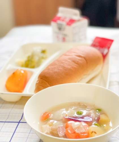 今日の献立は、コッペパン、牛乳、鶏肉とさつまいものシチュー、はくさいのピクルス、かき、いちごジャムです。