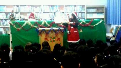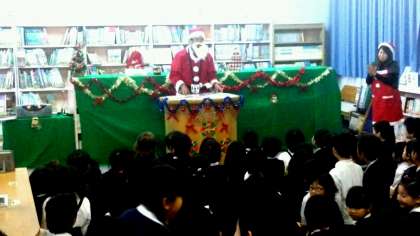 「スペシャルよもよもお話会」が開かれました。クリスマスの雰囲気たっぷりに装飾された図書室で静かに絵本のお話に聞き入る子どもたち。