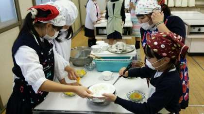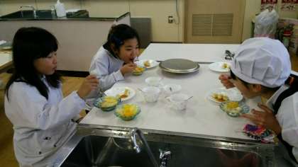 今日の手作りクラブは、調理実習!みたらし団子とフルーツポンチ。団子は上新粉と白玉粉を混ぜて、ぬるま湯を少しずつ入れながらこねていきます。お湯にくぐらせ、浮いてきたら2,3分待ちます。その後水で冷やし、ホットプレートで焼きました。先生が作ったあんをかけたり、フルーツポンチに入れたりとそれぞれの班でおいしくいただきました。