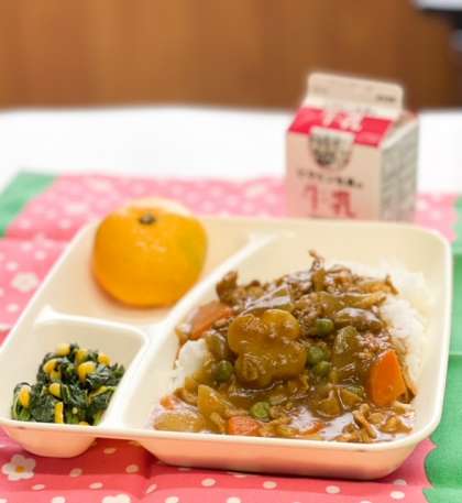 今日の献立は、ポークカレーライス、ほうれんそうのソテー、みかん、牛乳です。