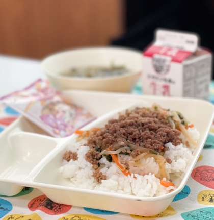 今日の献立は、ビビンバ、わかめスープ、いもけんぴフィッシュ、牛乳です。