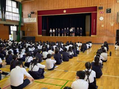児童会は運営委員が前期と後期で入れ替わります。今日は全校集会で、後期児童会の運営委員が自己紹介しました。しっかりと決意を述べる姿は頼もしいです。学校のリーダーとなる活躍を期待しています。
