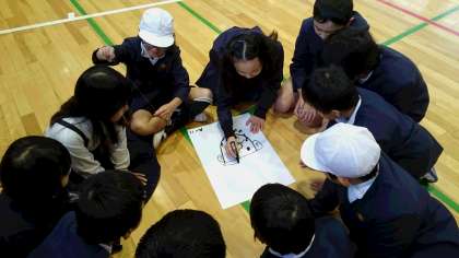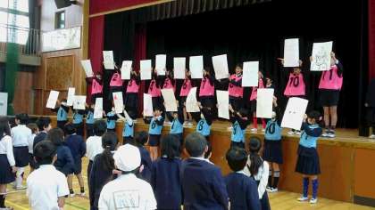 昨日の児童集会では、たてわり班で「サンタクロース絵描きリレー」をしました。