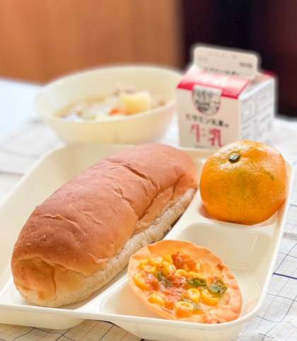 今日の献立は、黒糖パン、豚肉と野菜のスープ煮、変わりピザ、みかん、牛乳です。