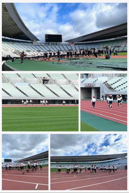 6年生は、長居スタジアムにスポーツ交歓会に来ています。世界規模の大会が開かれる本格的なトラックで、午前は100m走、400m走、400mリレーをします。