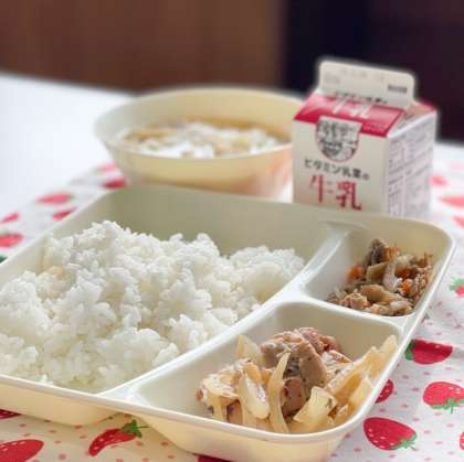 今日の献立は、鶏肉の梅風味焼き、うすくず汁、きんぴらごぼう、ごはん、牛乳です。