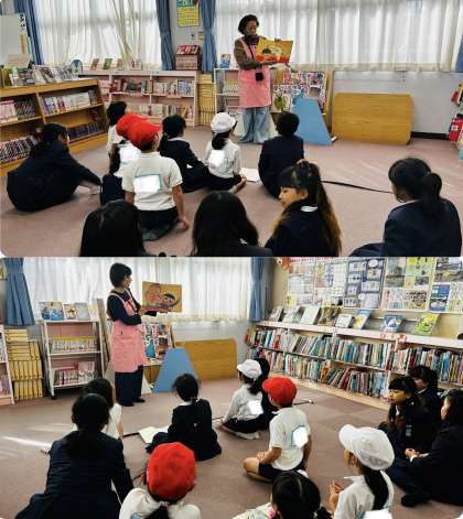 今日の20分休みには、「よもよもお話会」がありました。保護者ボランティアのよもよもさんが4人も来てくださり、4冊の絵本を読み聞かせしていただきました。おもしろい本や不思議な本、なぞなぞの本などさまざまなジャンルの絵本を読んでくださいました。