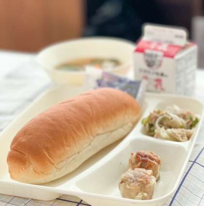 今日の献立は、コッペパン、焼きシューマイ、中華みそスープ、ツナと野菜のオイスターソースいため、ブルーベリージャム、牛乳です。