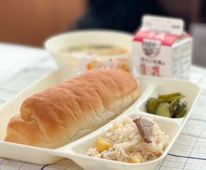 12/9の献立は、コッペパン、中華おこわ、卵スープ、きゅうりのピリ辛あえ、牛乳です。