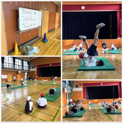4年生は体育の時間にマット運動に取り組んでいます。基本の技となる前転や後転を美しく回れるように練習中。傾斜ありのコーナーを設けるなど、習熟段階に応じて場を選ぶことができるように工夫していました。