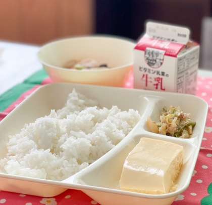今日の献立は、ごはん、卵どうふ、一口がんもと野菜の煮もの、キャベツとピーマンのそぼろいため、牛乳です。