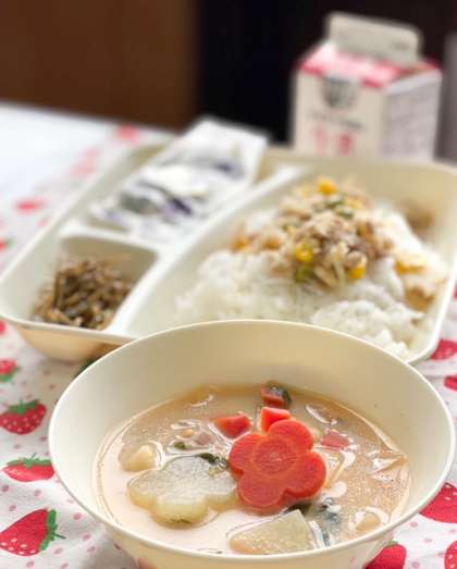 1/15の給食は、お正月の行事献立でした。れんこんのちらしずし、雑煮、ごまめ、牛乳といった内容。雑煮は各地でいろいろな風習がありますが、関西風の白みそを使ったものが提供されました。だいこんや金時にんじんは、お正月らしく花形にくり抜かれていました。