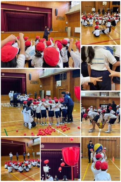 今日は3小の1年生が九条東小学校に集まり、ジャンケン大会やグループ作りのゲーム、ボールを回していくゲーム、玉入れなどを楽しみました。幼稚園や保育園で一緒だった友だちとの再会の場面があり、新しい友だちと会話を交わす場面もあり、充実した一日となりました。