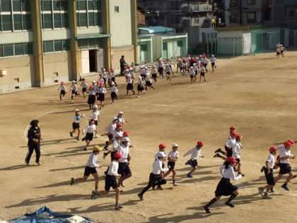 子どもたちは、自分のペースで気持ち良くかけ足していました。