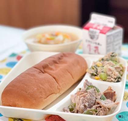 今日の献立は、こくとうパン、豚肉のオイスターソース焼き、中華スープ、ツナとチンゲンサイのいためもの、牛乳です。