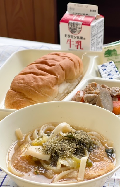 今日の献立は、コッペパン、豚肉とごぼうの煮もの、なにわうどん、ソフトマーガリン、固形チーズ、牛乳です。なにわうどんの具材には、うすあげやかまぼこ、はくさいが入っており、とろろこんぶをかけていただきます。大阪のうどんは、だし、具材、麺の全てがバランスよく含まれていること。自分たちが暮らす大阪の文化を、子どもたちには後世にも引き継いでいって欲しいですね。