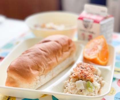 2/19の献立は、レーズンパン、押麦のグラタン、スープ、デコポン、牛乳です。