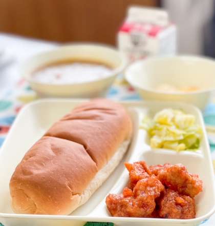今日の献立は、黒糖パン、あげどりのバーベキューソース、カレースープ、キャベツとコーンのサラダ、フルーツゼリー、牛乳です。今日は卒業お祝いのスペシャル献立で、いつもより品数多く提供されています。6年生が登校するのもあと2週間程度。小学校の思い出もしっかり噛み締めながら味わって欲しいです。