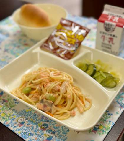 今日の献立は、ミニコッペパン、さけのクリームスパゲッティ、キャベツときゅうりのサラダ、おさつチップス、牛乳です。