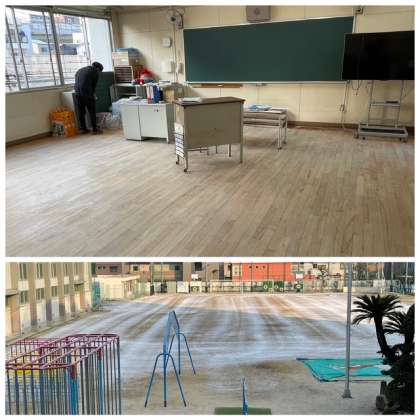 写真は、教室の大掃除をしている様子と、運動場ににがりまき(砂が舞い上がるのを防止するため)の様子です。他にも教材や備品の状況を確認したり、図書などの破損についても調べています。